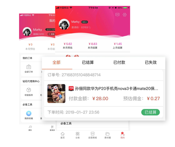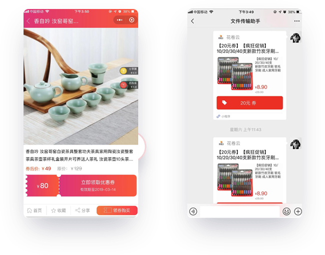 花卷云淘客小程序与APP实现数据的完美同步对接,实现了在小程序端京东、拼多多商品优惠券的领取和正常返佣,领券后跳转至对应官方的小程序实现领券和购买,完美闭环。
