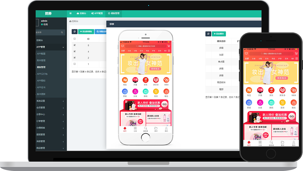您的装修操作过程可实时同步预览,所见即所得,个性化APP制作仅需使用鼠标拖拽操作即可完成!APP装修不求人,零技术基础也能轻松完成装修任务,灵活设计您的专属淘客APP!